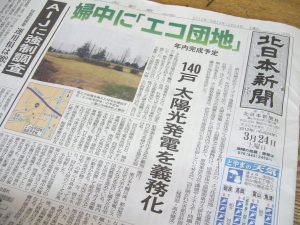 3月24日付の北日本新聞1面に「エコ団地」のタイトル。記事には「140戸太陽光発電を義務化」の文字。開発される場所は富山市婦中町、現在新興住宅地として数年前から分譲が盛んにおこなわれている地域。東日本大震災以降、国民の環境やエネルギーへの意識が変わり、全国的にもスマートシティなど住宅業界を取り巻く環境も変化しています。富山市は、環境モデル都市として早くからエコをテーマにした都市開発を進め、市内を走行するライトレール(LRT)、街中居住の推進などコンパクトで生活しやすい街づくりを目指している。そんな富山市だからこそ、実現できた地方では先駆的な取り組みなのではないだろうか。また、県内では一番初めに取り組む開発業者の方にも、やはり賛辞と共に敬意を表したい。